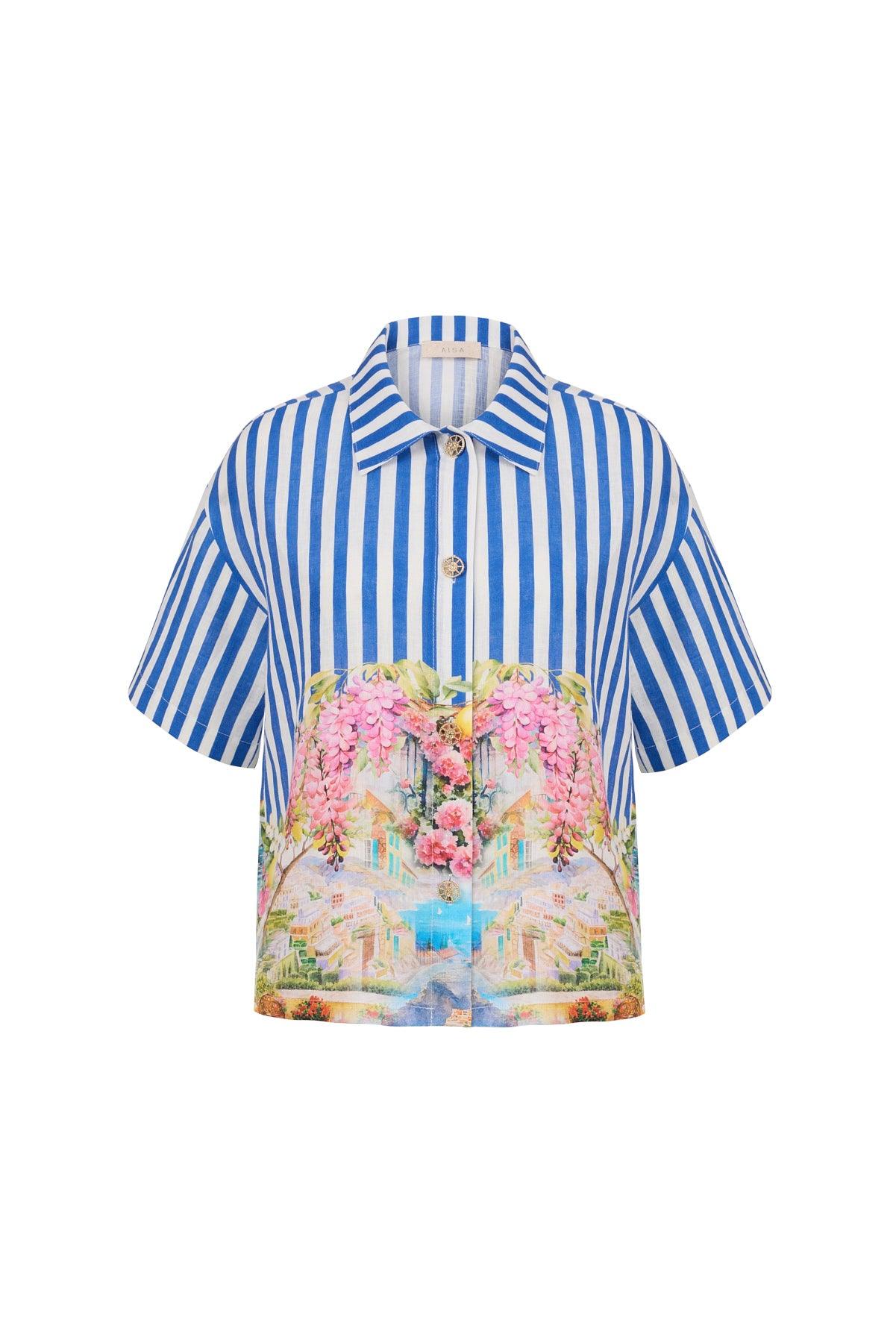 From our Sun Kissed Collection, the off-shoulder, short sleeve, striped-floral Capri Shirt.