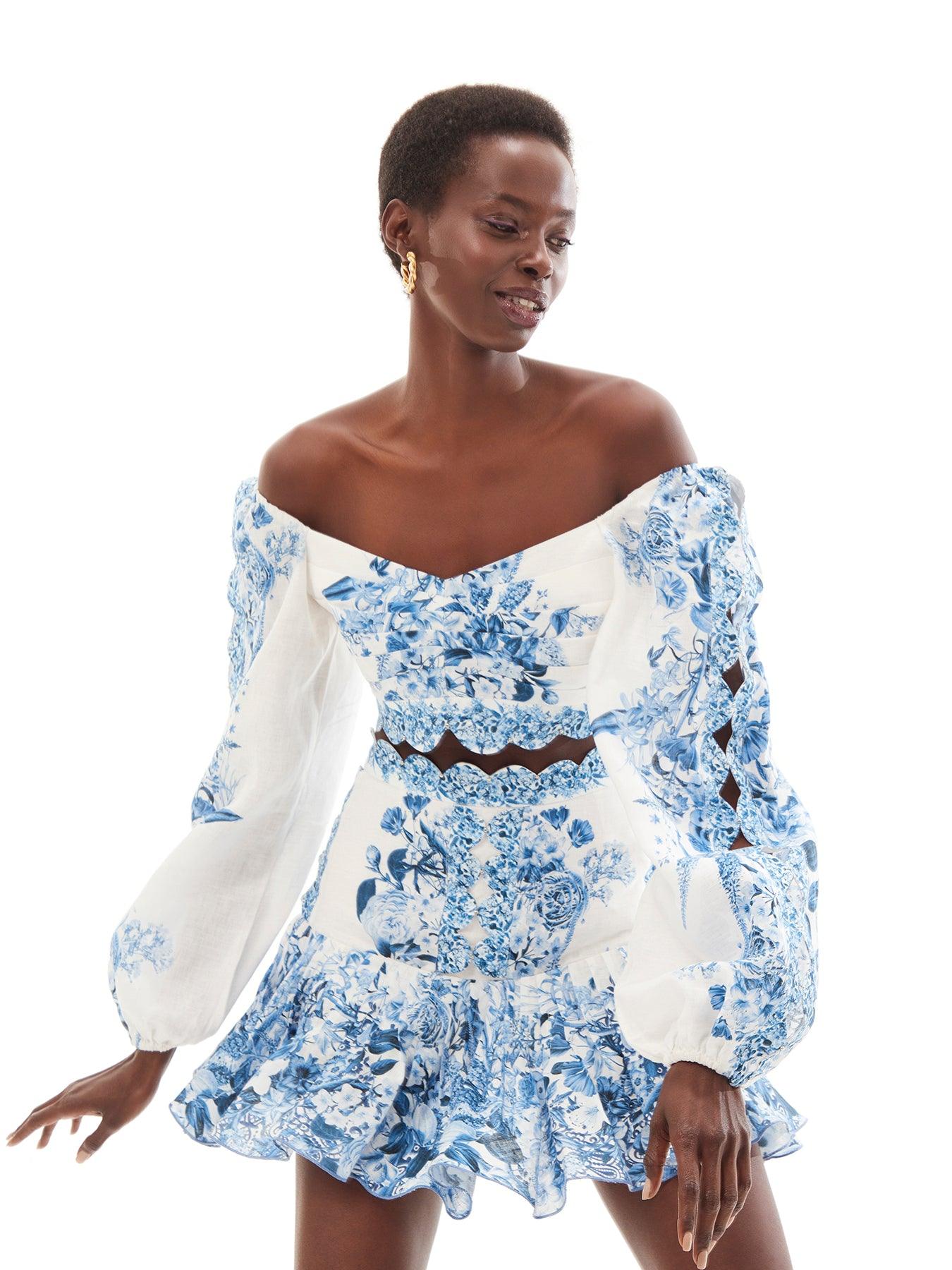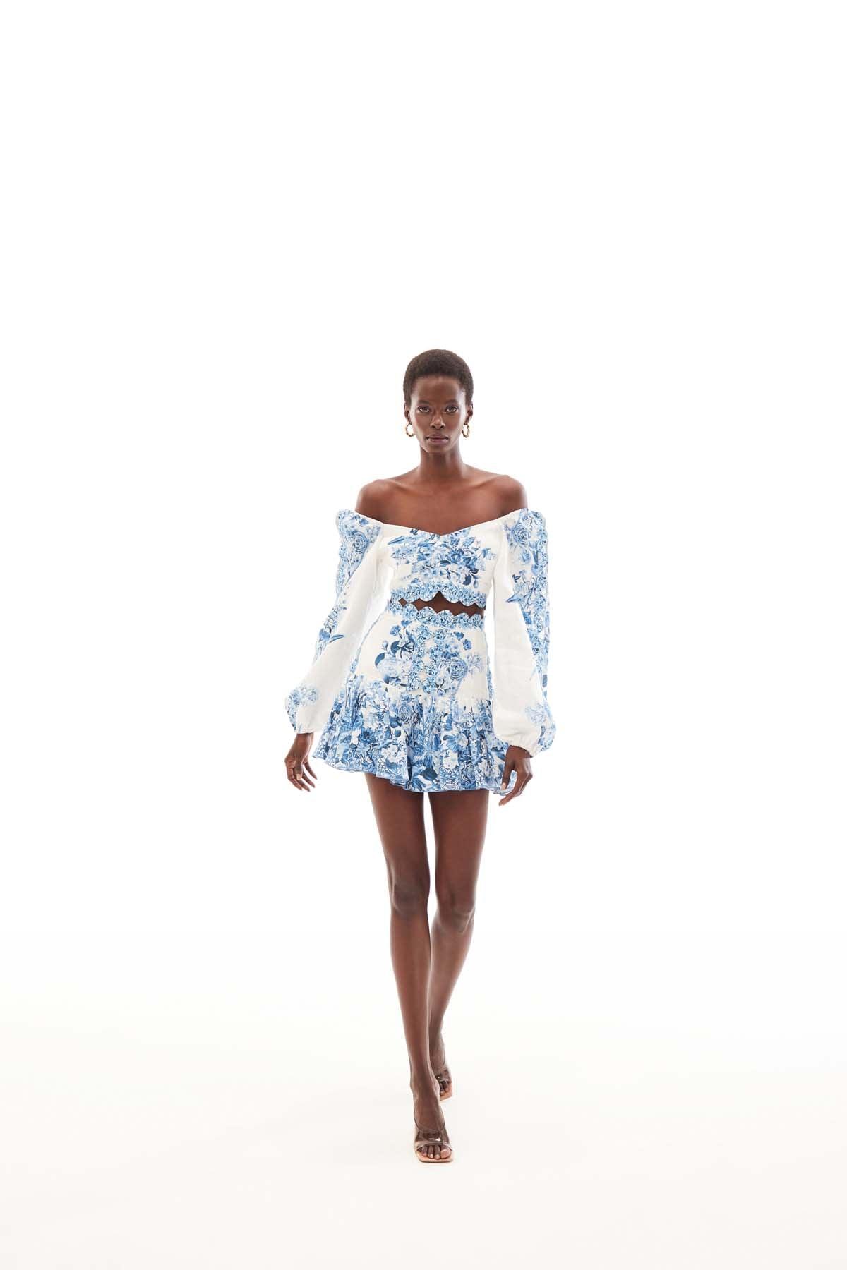 Diamante Skirt from our Sunrise and Sunset Collection. Flounced linen miniskirt with a flounce waistband.