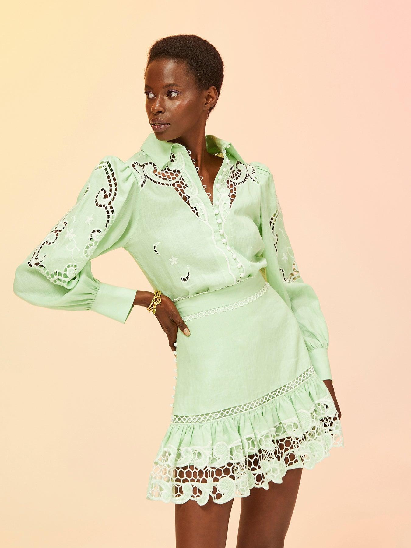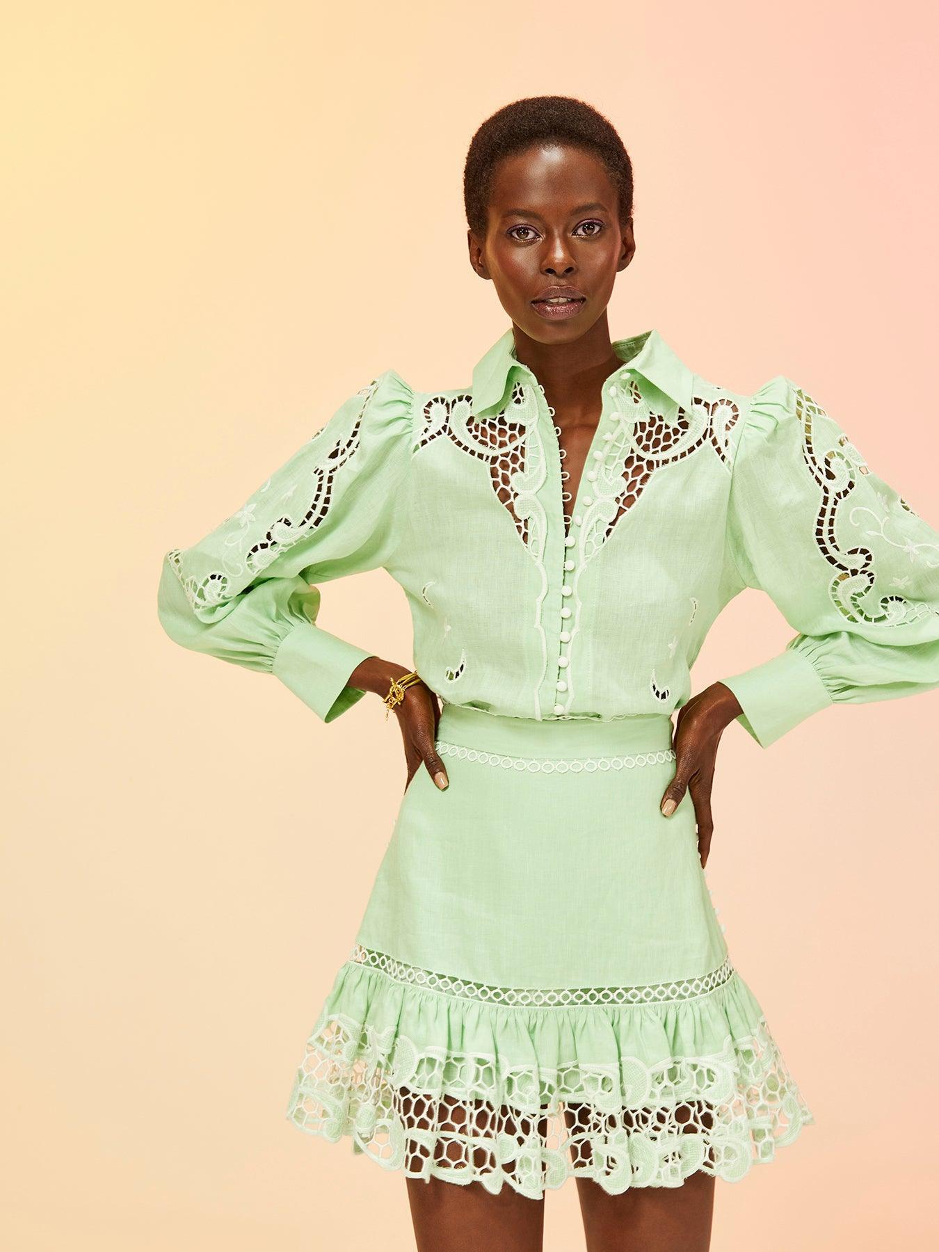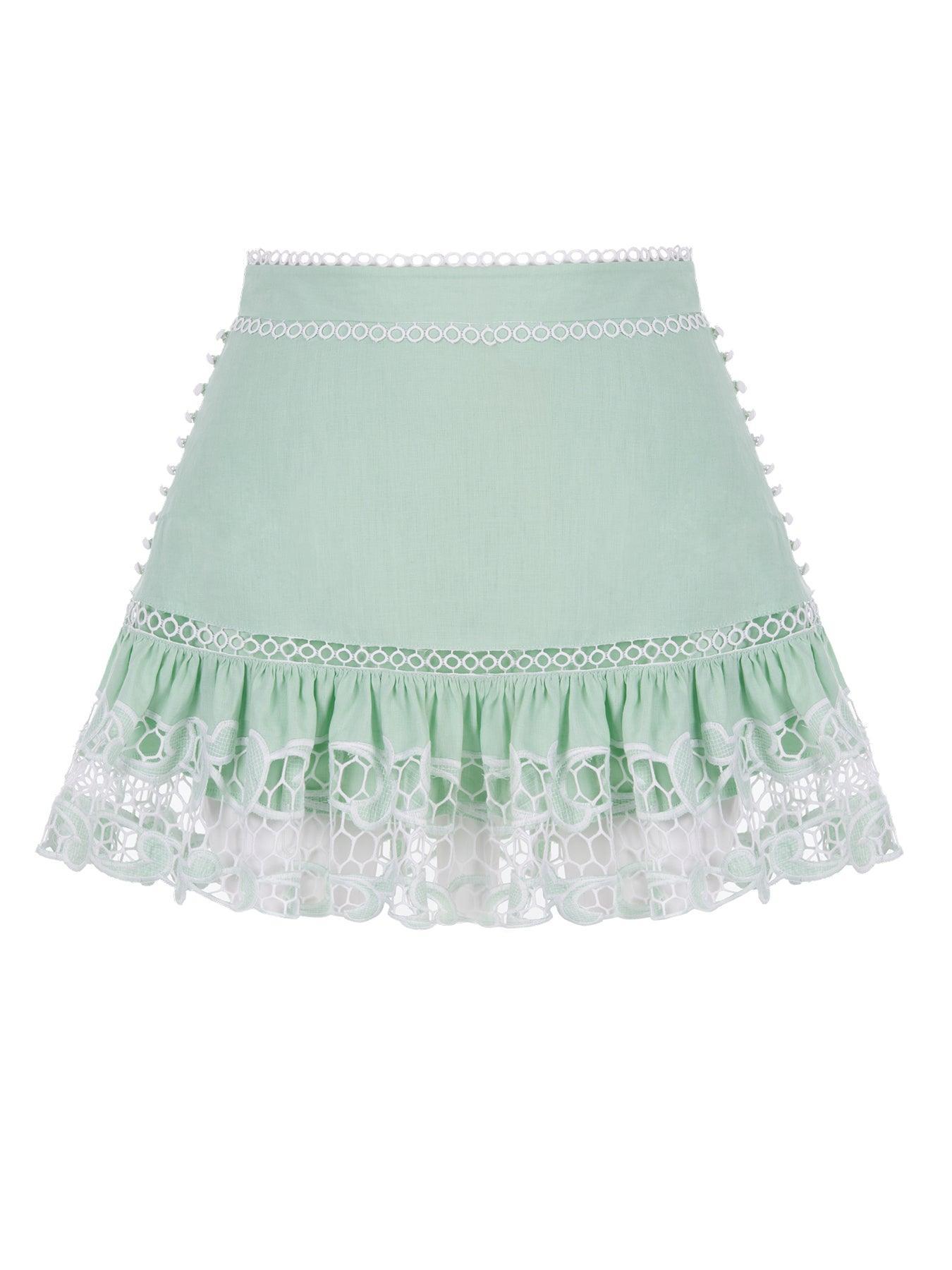 Embroidered Giselle Skirt from our Luminous Collection. Mini skirt with broderie embroidery on the hem.