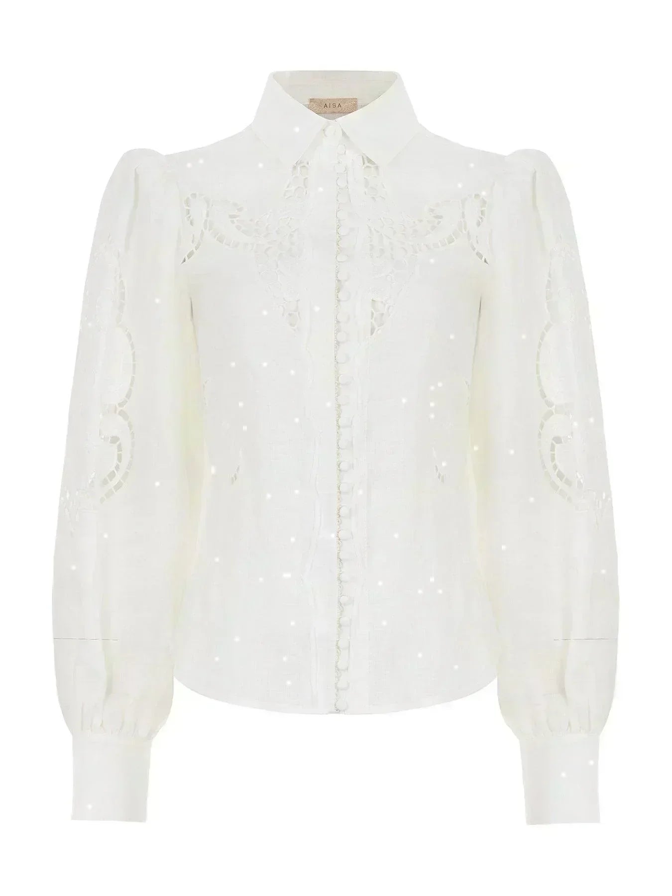Giselle Shirt with broderie anglaise from our Luminous Collection. Linen shirt with openwork broderie anglaise on the sleeves, collar and back.