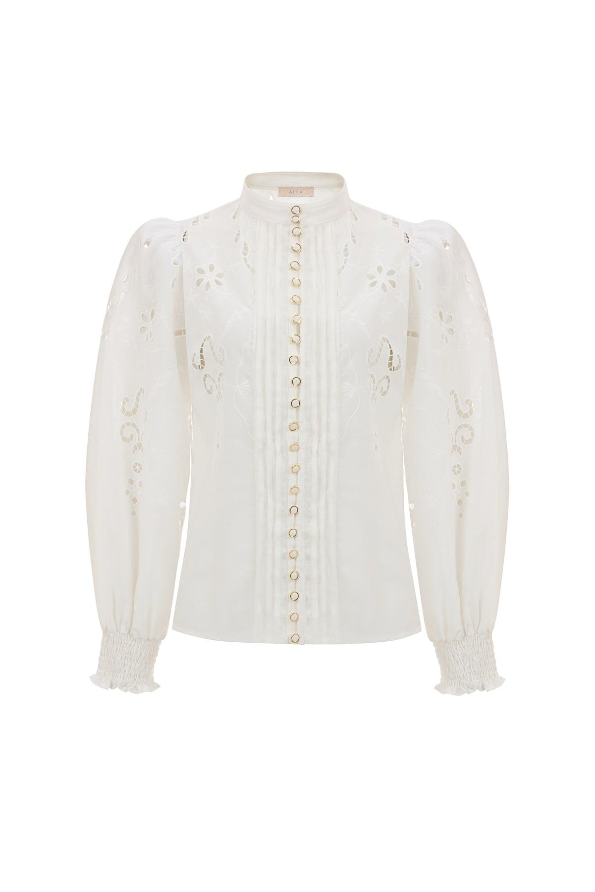 From our Sun Kissed Collection, the mandarin collar, broderie anglaise, balloon sleeve Jasmine Shirt.