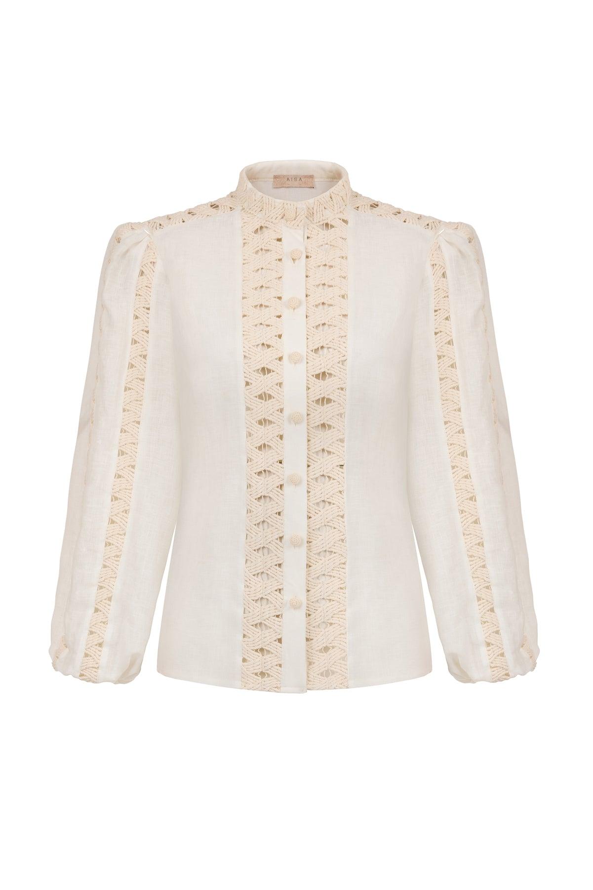 From our Sun Kissed Collection, the mandarin collar, rope embroidered, long-sleeve Lea Shirt.