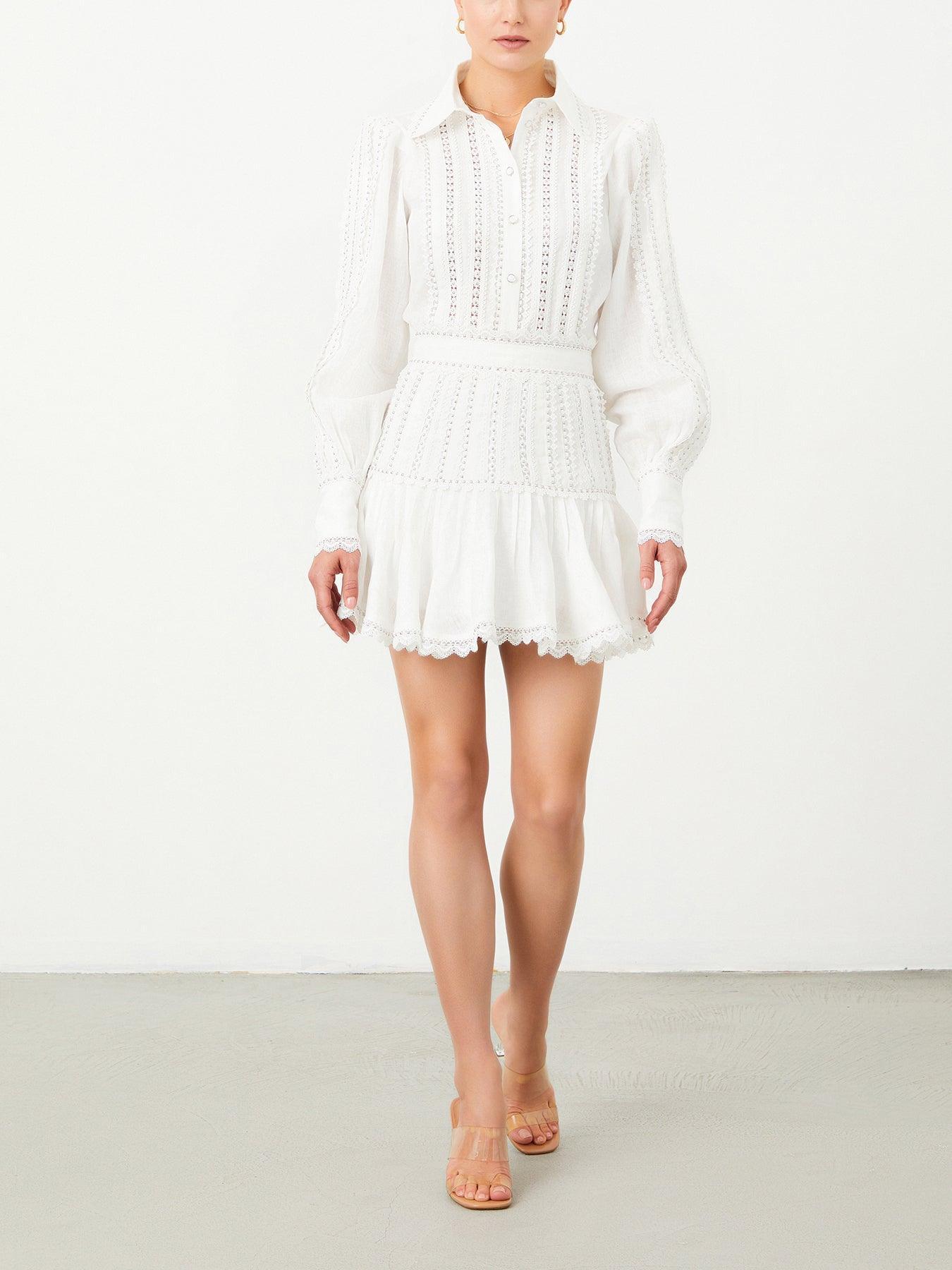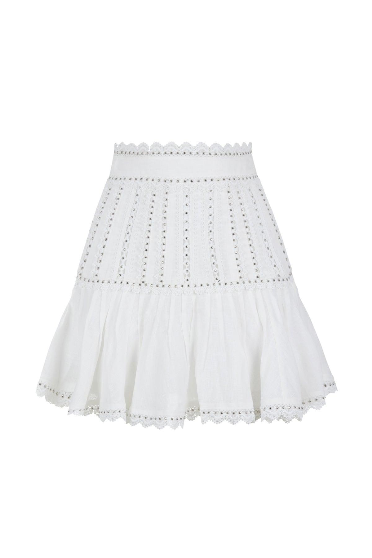 Metal beaded Leonore Skirt with guipure trim from our Luminous Collection. Mini skirt with ruched and beaded top and hem.