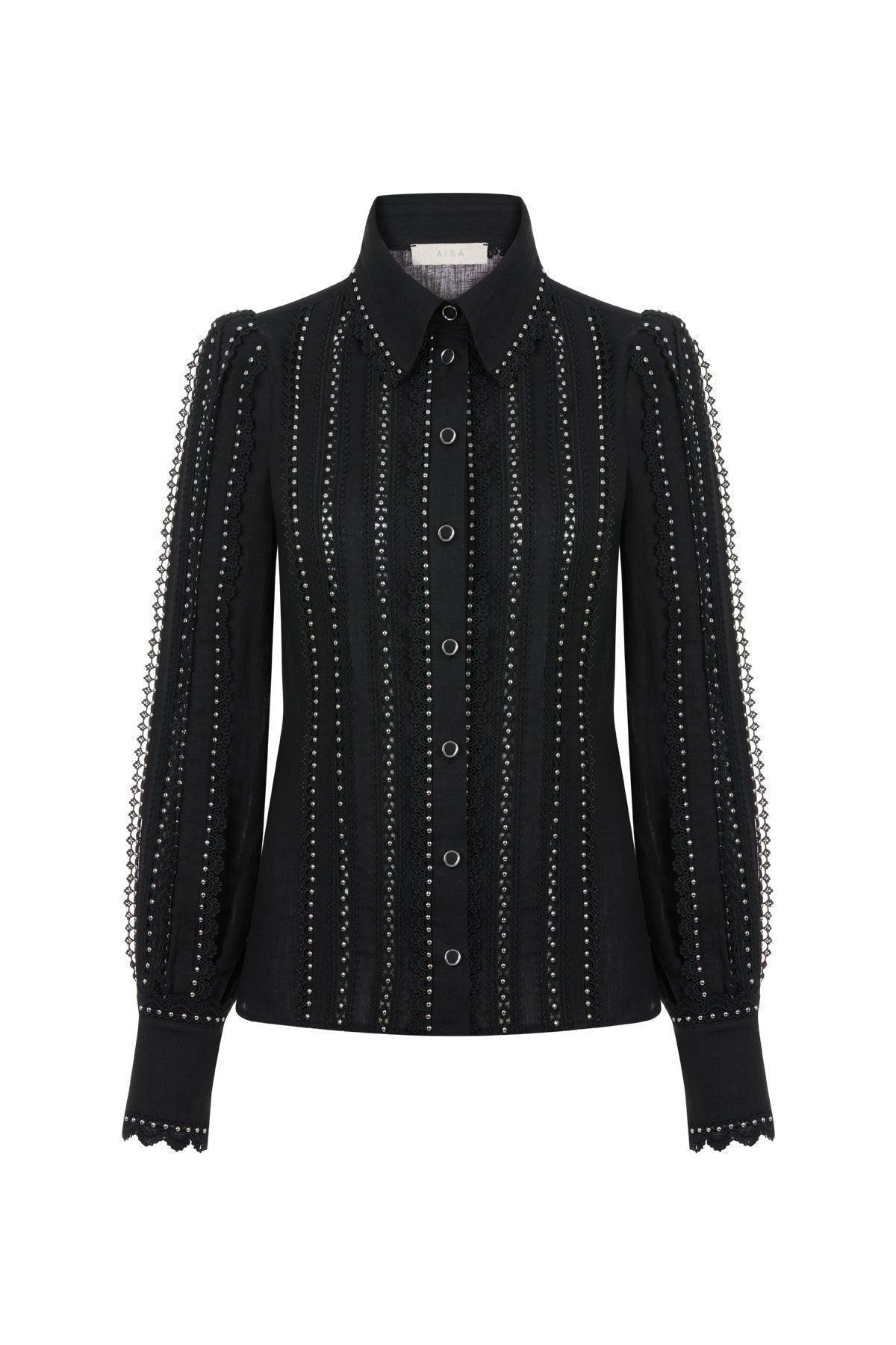 Metal beaded Leonore Shirt with guipure trim from our Luminous Collection. Shirt with plain back and lace and beads on the front.