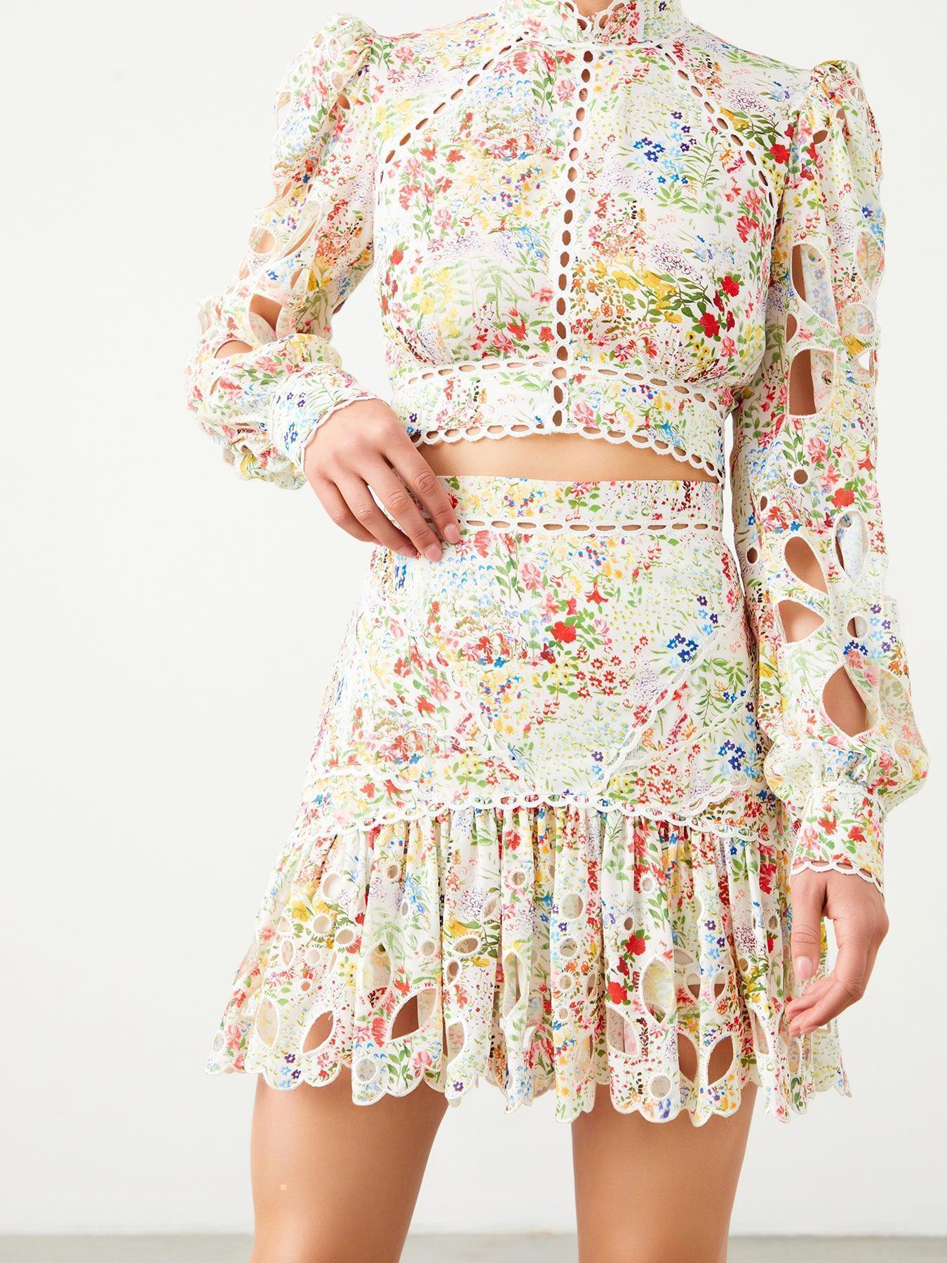 Nicy Skirt from our Blossom & Sun Collection. Mini skirt with floral pattern, window detail and pleated hem.