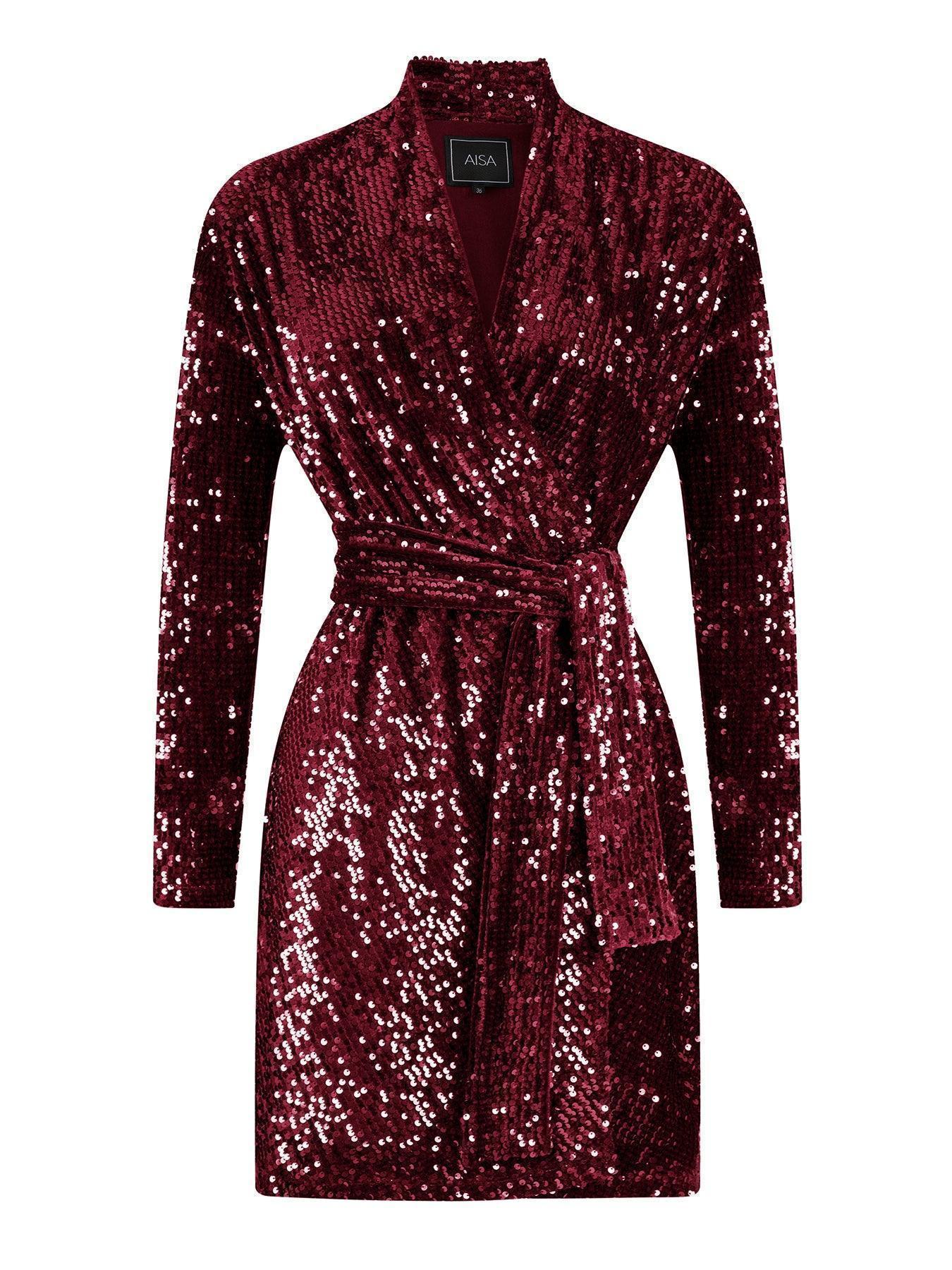 Red sequined mini jacket dress.