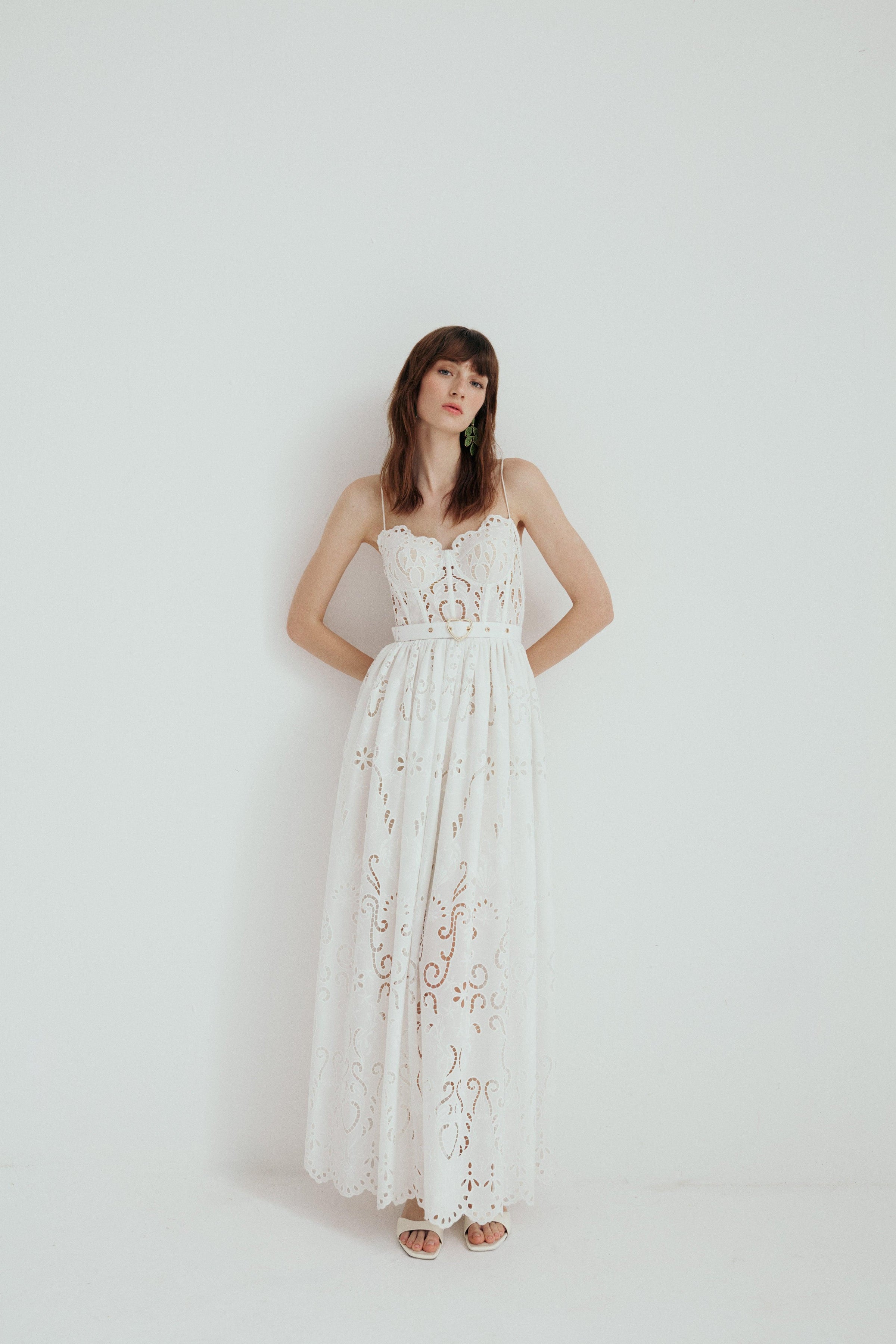 From our Sun Kissed Collection, the thin-strapped, backless, embroidered lace long Jasmine Dress.