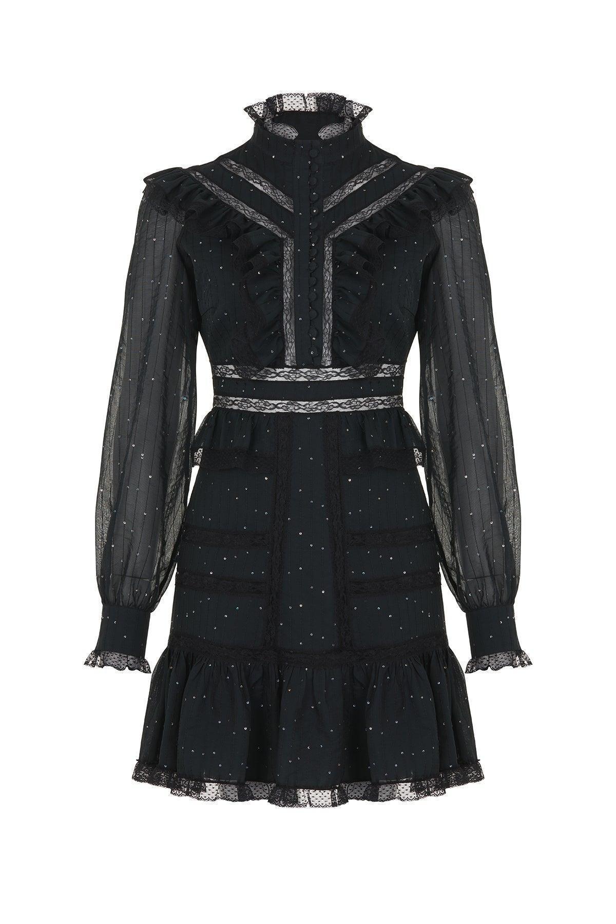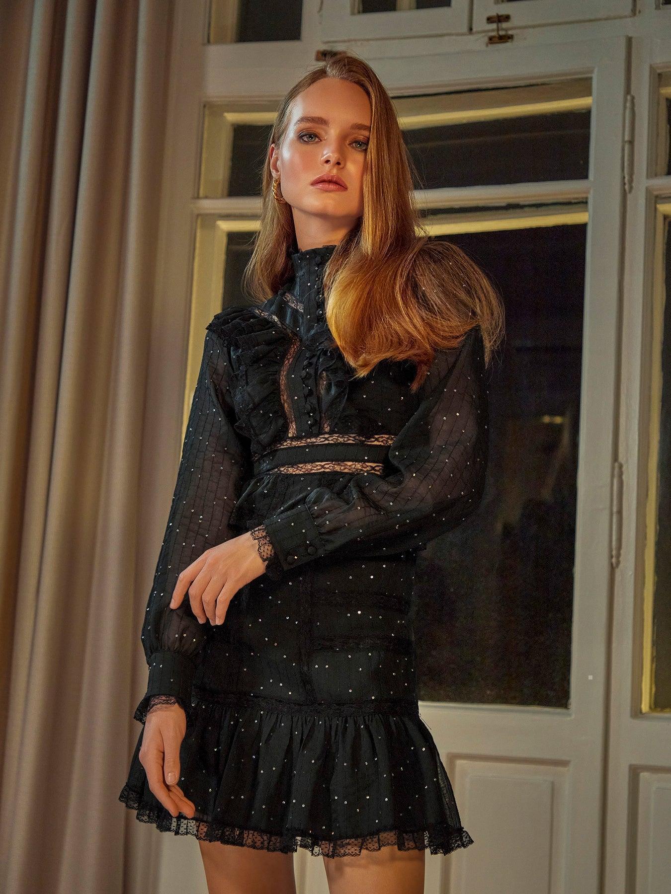 Leggero Dress from our Glitz & Glam Collection. Mini dress with transparent lace waist detail and ruffle detail that hugs the body.