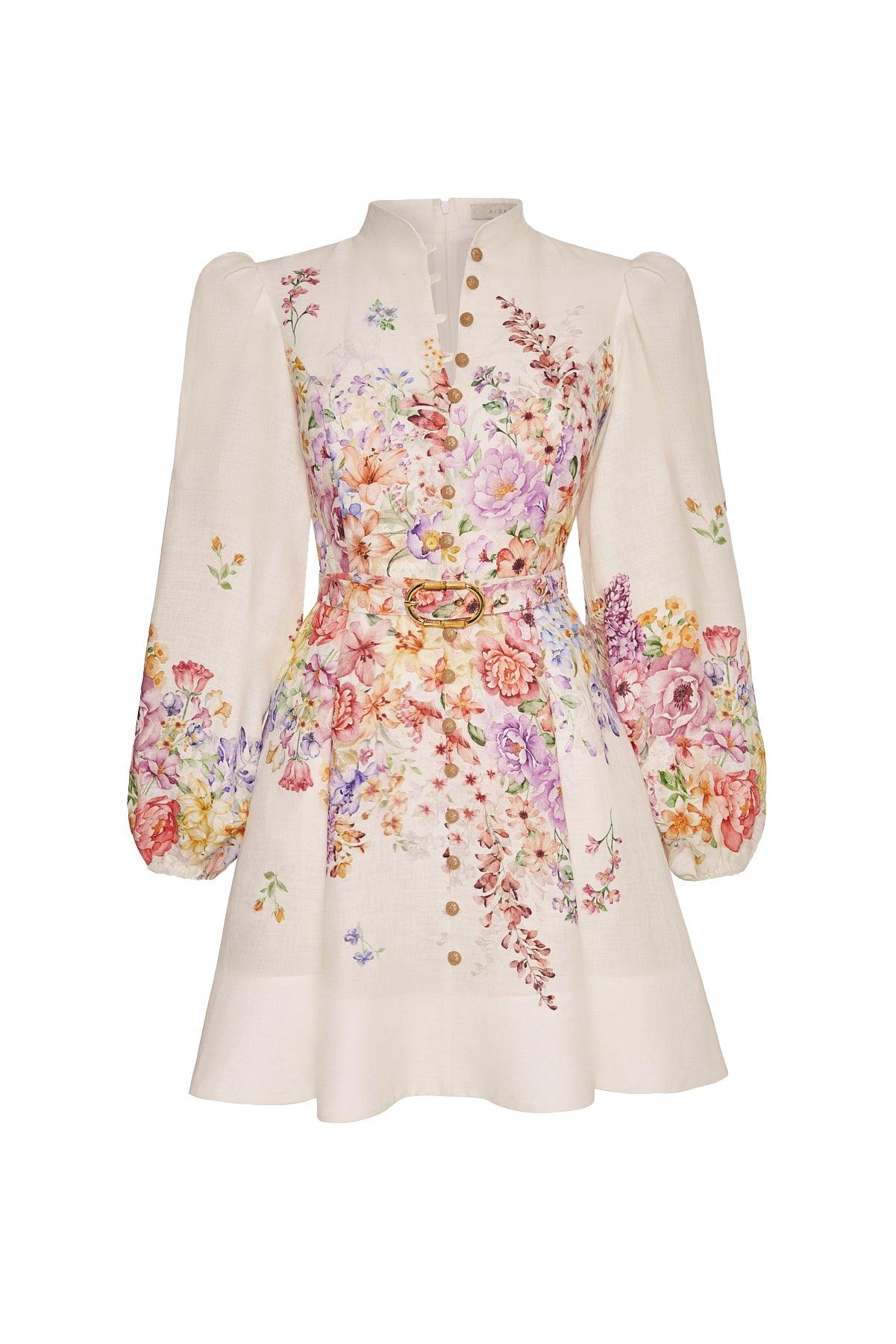 From our Sun Kissed Collection, the mandarin collar, balloon sleeve, floral mini Vivienne Dress.
