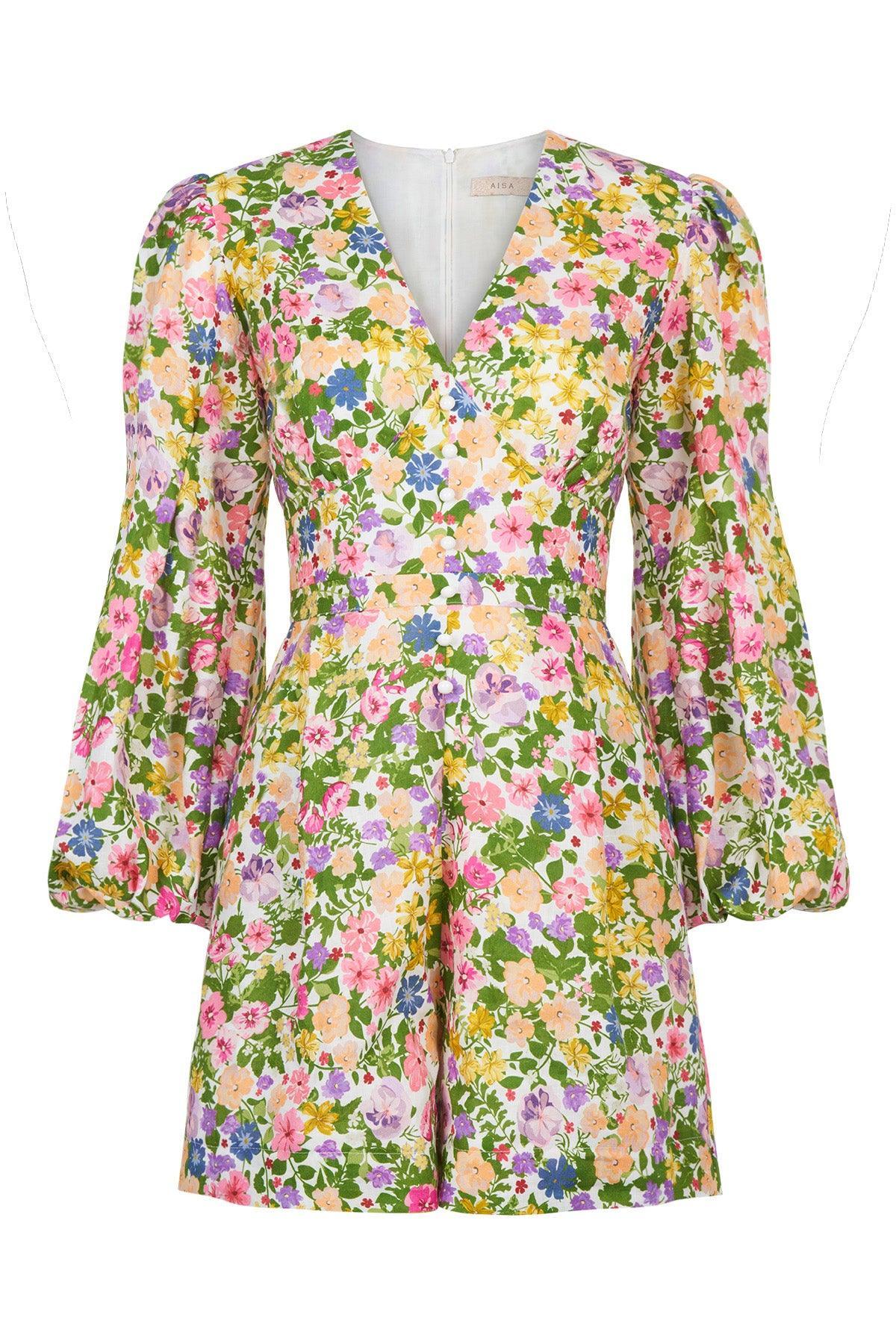 Rosalie Jumpsuit from our Blossom & Sun Collection. Multi-coloured, waist-fit, long-sleeved linen short jumpsuit with pockets.